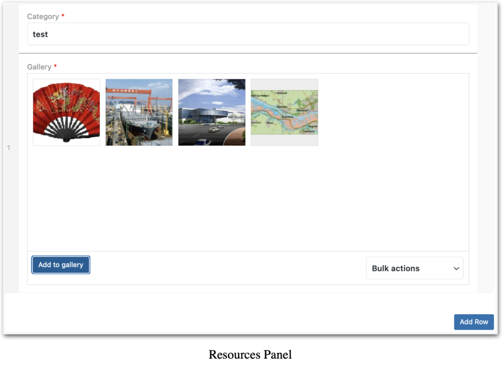 Here you can add, edit, and/or remove images added inside the Resources Panel. Each row requires a category label and an image gallery. Once saved, the gallery will be accessible inside the Resource Panel, on the right side of the Builder top toolbar.