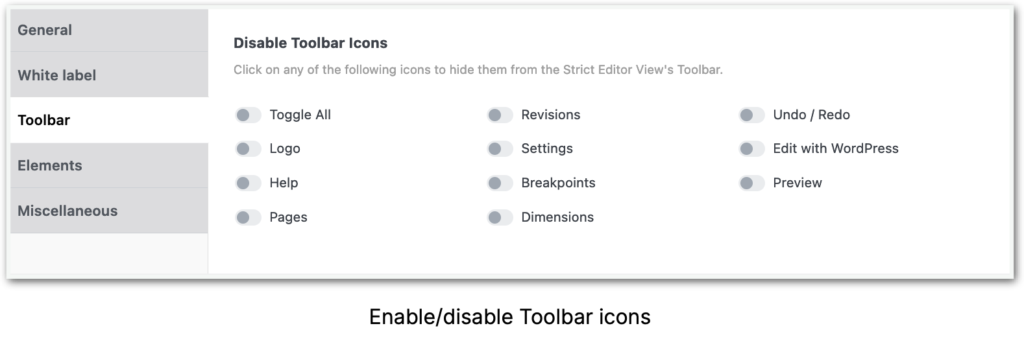 Click on any of the following icons to hide them from the Strict Editor View’s Toolbar.