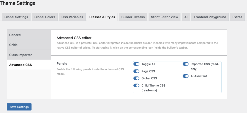 Toggle On/Off will enable/disable the following panels inside the “Advanced CSS’ modal at the bottom of the page (see the next chapter about Advanced CSS).