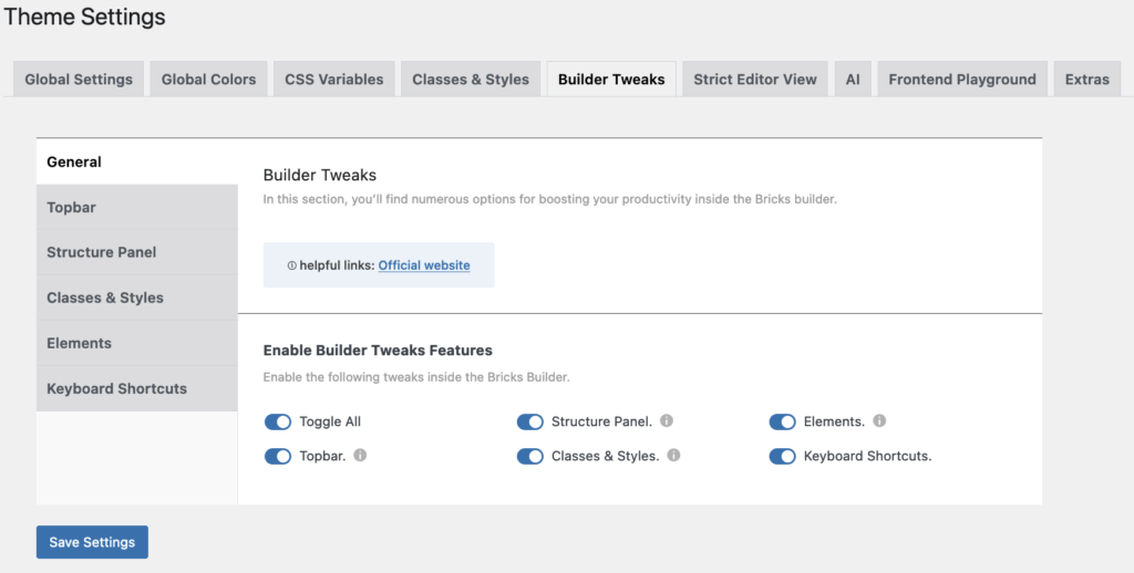 Enabling the panels will create new features and icons in the workspace of Bricks, and will enhance productivity in the Topbar, Structure Panel, Classes & Styles, and Elements.